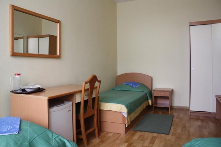 - 3-местные номера. Площадь номера - 15 кв. м. В номере: три кровати, стол, стул, три тумбы, шкаф, багажная тумба, вешалка настенная, зеркало. Без балкона. Всего 14 номеров.