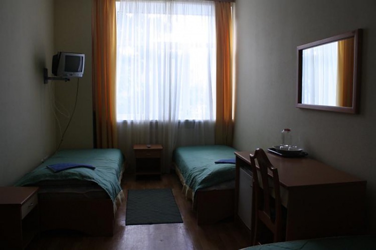 - 2-местные номера. Площадь номера - 12 кв. м. В номере: две кровати, стол, стул, две тумбы, шкаф, багажная тумба, вешалка настенная, зеркало. Без балкона. Всего 6 номеров.