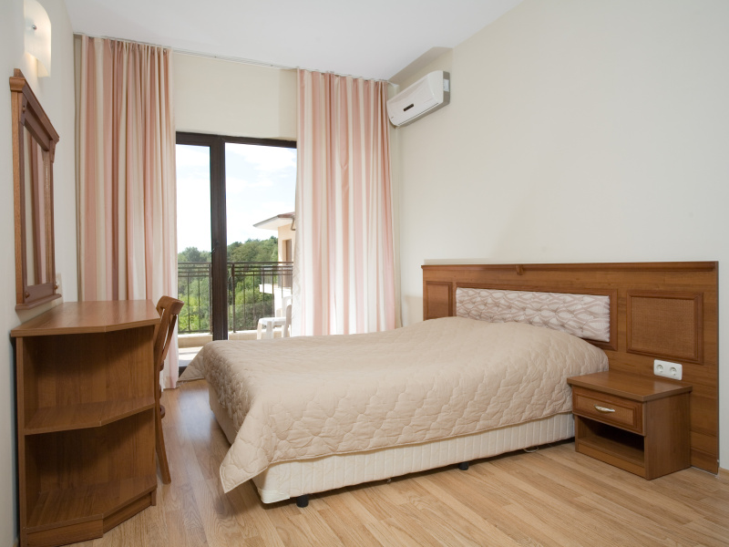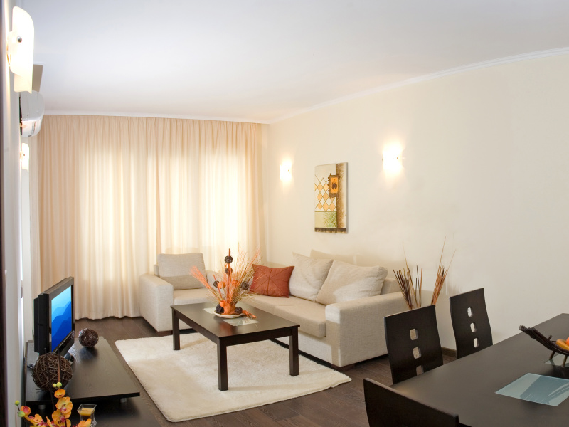 - Studio (50 кв.м.) – двуспальная кровать, доп. место - диван-кровать, кондиционер, TV SAT, телефон, кухонный блок, холодильник, доступ в интернет, балкон, душ, сушилка для белья, пол – плитка.