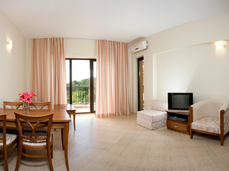 - Ap2pax (70 кв.м.) – спальня, гостиная (межкомнатная дверь), двуспальная кровать, доп. место - диван-кровать, кондиционер, TV SAT, телефон, кухонный блок, холодильник, доступ в интернет, балкон, душ, сушилка для белья, пол – плитка.