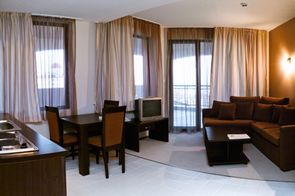 - Studio – двуспальная кровать / две отдельные кровати, вид на море, вид на парк, кондиционер, TV SAT, телефон, холодильник, кухонный блок, доступ в интернет, балкон, душ, фен.