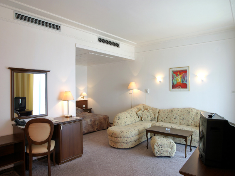 - Maisonette4рах (160 кв.м) – спальня, гостиная, межкомнатная дверь, двуспальная кровать/две отдельные кровати, кондиционер, TV SAT, телефон, мини-бар, кухонный блок, электрочайник, сейф, доступ в интернет, балкон, ванна/душ, фен.