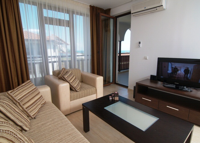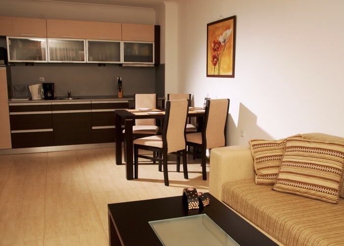 - Ap2pax (55 кв.м.) – спальня, гостиная с мягкой мебелью (межкомнатная дверь), двуспальная кровать/две отдельные кровати, доп. место - диван-кровать, кондиционер, TV SAT, кухонный бокс (электропечь, духовка, микроволновая печь, электрочайник, кофеварка, тостер), холодильник, балкон, душ, косметический набор в ванной, сушилка для белья, гладильная доска, утюг, пол – плитка.
