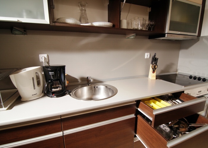 - Studio (37 кв.м) – двуспальная кровать, кондиционер, TV SAT, кухонный бокс (электропечь, духовка, микроволновая печь, электрочайник, кофеварка, тостер), холодильник, балкон, душ, косметический набор в ванной, сушилка для белья, гладильная доска, утюг, пол – плитка.
