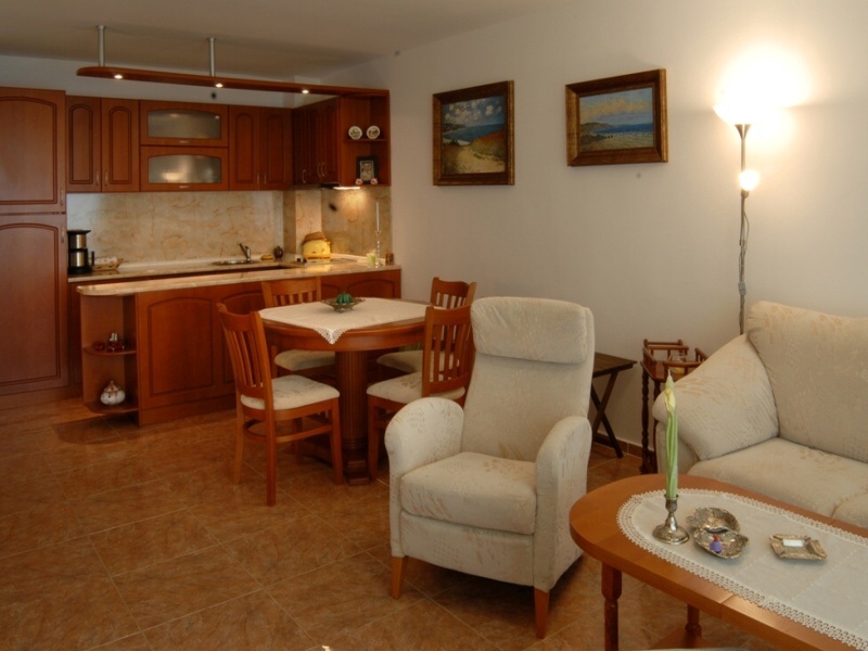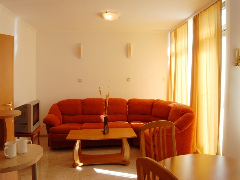 - Ap2pax (60 кв.м.) – спальня, гостиная с мягкой мебелью (межкомнатная дверь), двуспальная кровать/две отдельные кровати, доп. место - диван-кровать, кондиционер, TV SAT, кухонный бокс (электропечь, духовка, микроволновая печь, электрочайник, тостер), холодильник, доступ в интернет, балкон, душ, косметический набор в ванной, сушилка для белья, гладильная доска, утюг, пол – плитка.