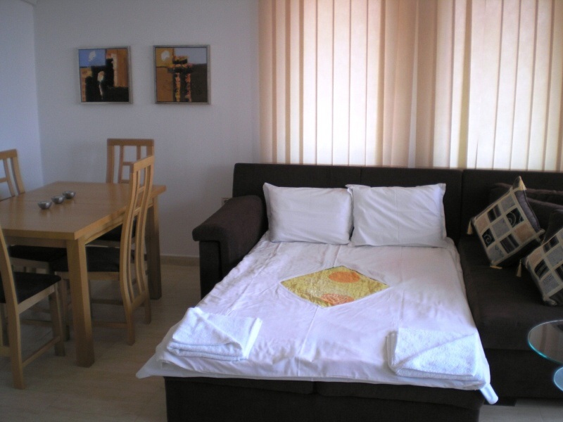- Ap2pax (55 кв.м.) – спальня, гостиная с мягкой мебелью (межкомнатная дверь), двуспальная кровать/две отдельные кровати, доп. место - диван-кровать, кондиционер, TV SAT, кухонный бокс (электропечь, духовка, микроволновая печь, электрочайник, кофеварка, тостер), холодильник, балкон, душ, косметический набор в ванной, сушилка для белья, гладильная доска, утюг, пол – плитка.