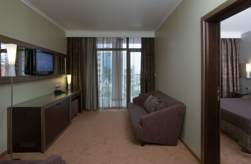 - Ap2pax (38 кв.м.) – спальня, гостиная с мягкой мебелью (межкомнатная дверь), двуспальная кровать, кондиционер, TV SAT, телефон, холодильник, сейф (доп. оплата), доступ в интернет, балкон, ванна, душ, фен, халат/тапочки (бесплатно), косметический набор в ванной, сушилка для белья, пол – ковролин.