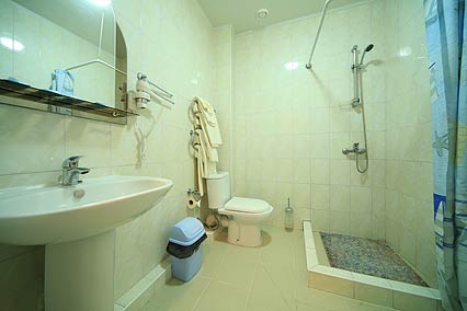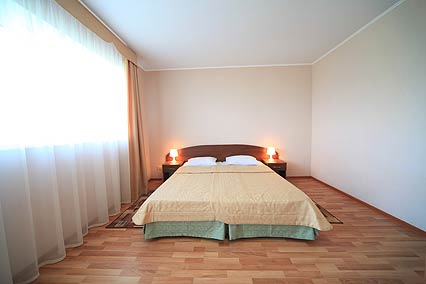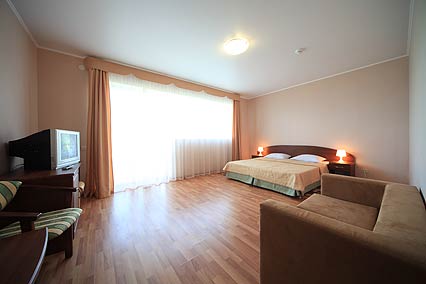 - двуспальная кровать, прикроватные тумбочки, диван, кресло, шкаф, журнальный столик, стулья, вешалка, зеркало Оборудование: система общего кондиционирования, телевизор, холодильник Санузел: с душем (поддон), фен, туалетные принадлежности Сервис: уборка номера ежедневно, смена постельного белья 1 раз в 4 дня, смена полотенец 1 раз в 4 дня