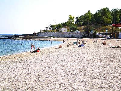 песчаный, в 450 м от корпуса, доставка на пляж производится лифтоподъемником