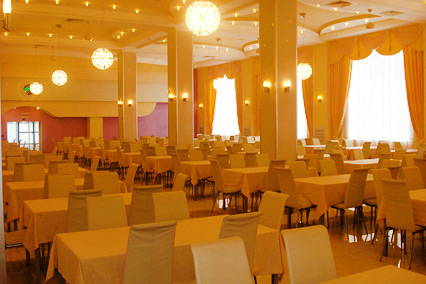 столовая отдельное здание, европейская кухня. 08.30-10.00 - завтрак, 13.00-14.30 - обед, 18.30-20.00 - ужин,