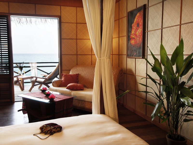 - Water Villas with Jacuzzi ( 90 кв.м )- великолепные водные виллы, стоящие на сваях, находящиеся всего в нескольких шагах от домашнего кораллового рифа с красочной подводной жизнью. Дополнительно: кровать с балдахином, TV, DVD-плеер, iPod станция, кофе машина для эспрессо, широкая двухуровневая надводная терраса с джакузи с шезлонгами и солнечными зонтиками.