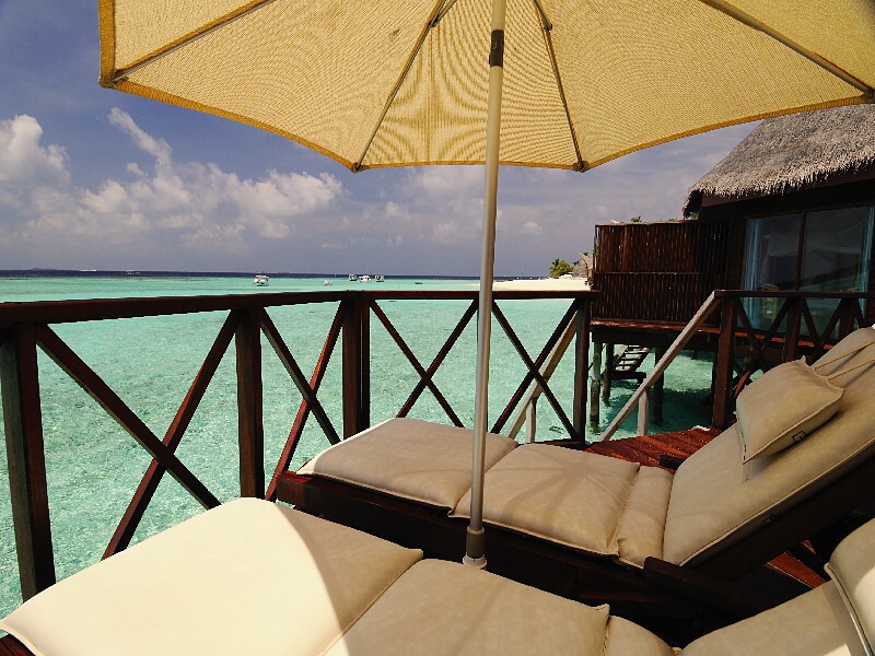 - Water Bungalow (37 кв.м.) - бунгало над водой. Спальня с деревянным полом, кресла и столик со стеклянной панелью и подсветка, ванная комната с ванной и душем, просторная веранда с лежаками и спуском в воду.