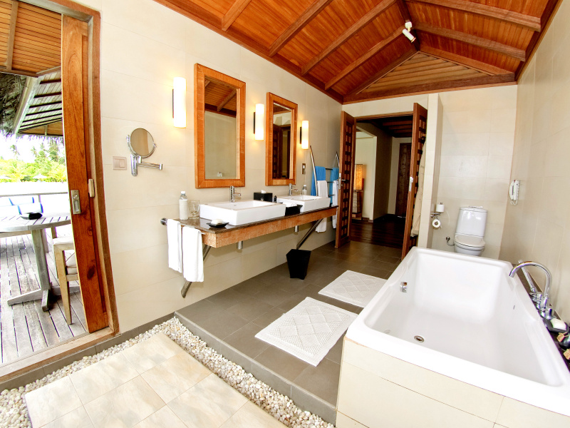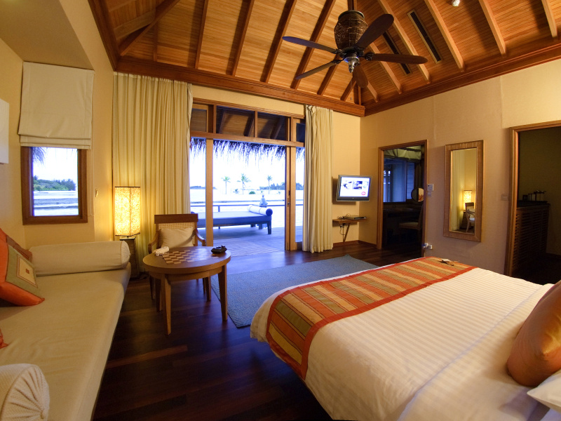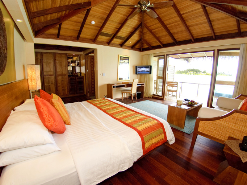 - Deluxe Over Water Bungalow (92 м², макс. 2 чел.). Дополнительно: ванна на двоих с видом на лагуну, мини-холодильник для вина, небольшой «бескрайний» бассейн на террасе.