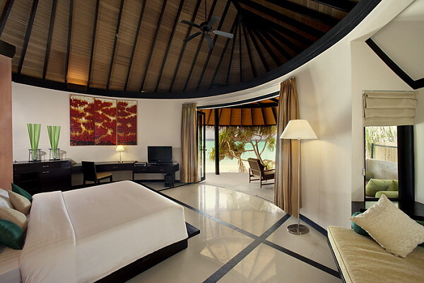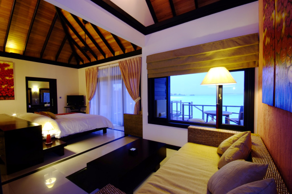 - Water Villa (73 кв.м., общая площадь - 85 кв.м.) – Вилла на воде. Спальня с гостиной зоной, терраса со спуском в лагуну, стеклянная панель в полу.