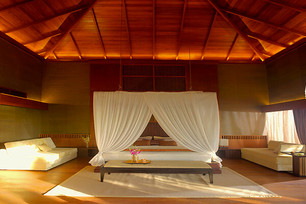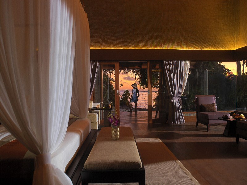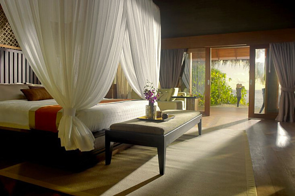 - Water villa with pool sunrise (200 кв. м): терраса с открытым персональным бассейном, спальня с гостиной зоной (кровать king-size), ванная комната с ванной и душем c функцией «тропический дождь» на открытом воздухе. Расположены на сваях над водой. Вид на лагуну и океан. Спуск в воду