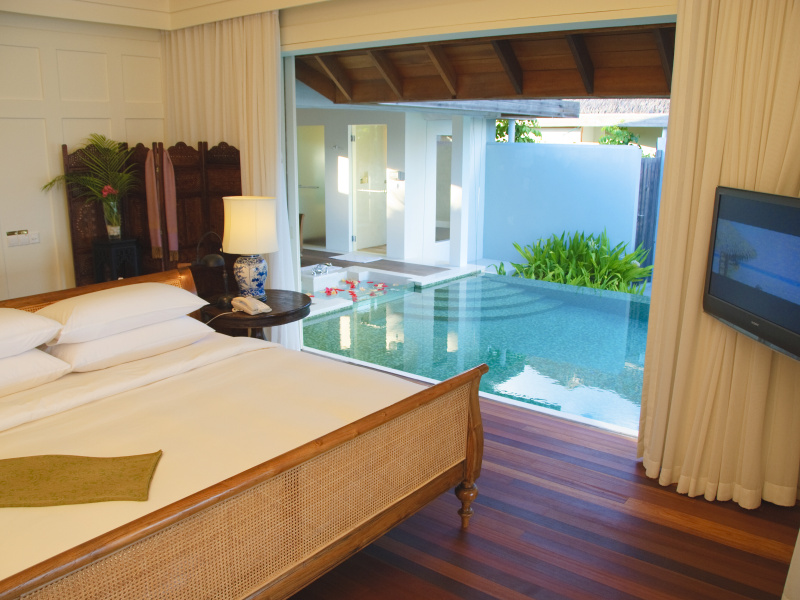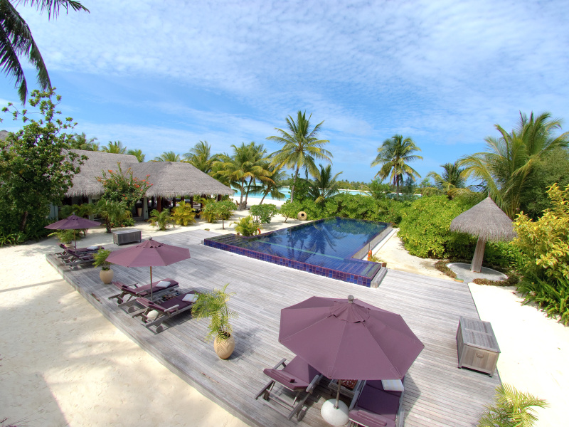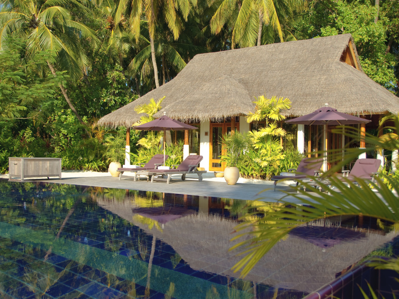 - Naladhu 2-bedroom pool residence (600 кв. м): двухэтажная вилла. На первом этаже: терраса с открытым персональным бассейном (95 кв. м), обеденная зона на открытом воздухе (стол на 6 персон), гостиная с обеденной зоной (стол на 6 персон), кухня, спальня двумя отдельными кроватями, гардеробная зона, ванная комната с ванной и душевой кабиной, душ на открытом воздухе. На втором этаже: балкон, спальня с кроватью king-size, гардеробная зона, ванная комната с ванной и душем с функцией «тропический дождь». Вид на океан.