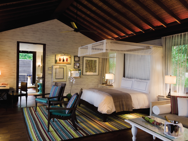 - 1 Executive Ocean View Suite (Two-Bedroom) (524 кв.м) - расположенный на гранитной террасе, в некотором удалении от берега, комплекс, состоящий из 3 павильонов . 2 спальни с ванными комнатами открытого плана с душем под открытым небом в огороженном мини-садике, и отдельный двухэтажный павильон с гостиной, столовой на 6 персон и кладовой с отдельным входом для обслуживающего персонала На площади в 313 кв.м располагаются открытая терраса (115 кв.м) с 4 шезлонгами, индивидуальный бассейн (78 кв.м) и джакузи. В каждой спальне: LCD 27", аудио/ видео система, беспроводной доступ в Интернет. Дополнительно к услугам гостей: вечерний коктейль у бассейна и услуги дворецкого Максимальное размещение - 4 взрослых, или 4 взрослых и 2 детей до 12 лет.