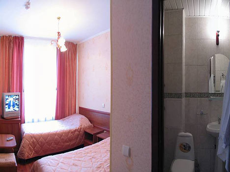 - Стандартный 2-местный 16 кв.м (мебель: двуспальная кровать или 2 односпальные, прикроватные тумбочки, шкаф-купе, вешалка, зеркало, телевизор, мини-холодильник, набор посуды, санузел: с душем (поддон), туалетные принадлежности, уборка номера ежедневно, смена постельного белья раз в 3 дня, смена полотенец ежедневно)
