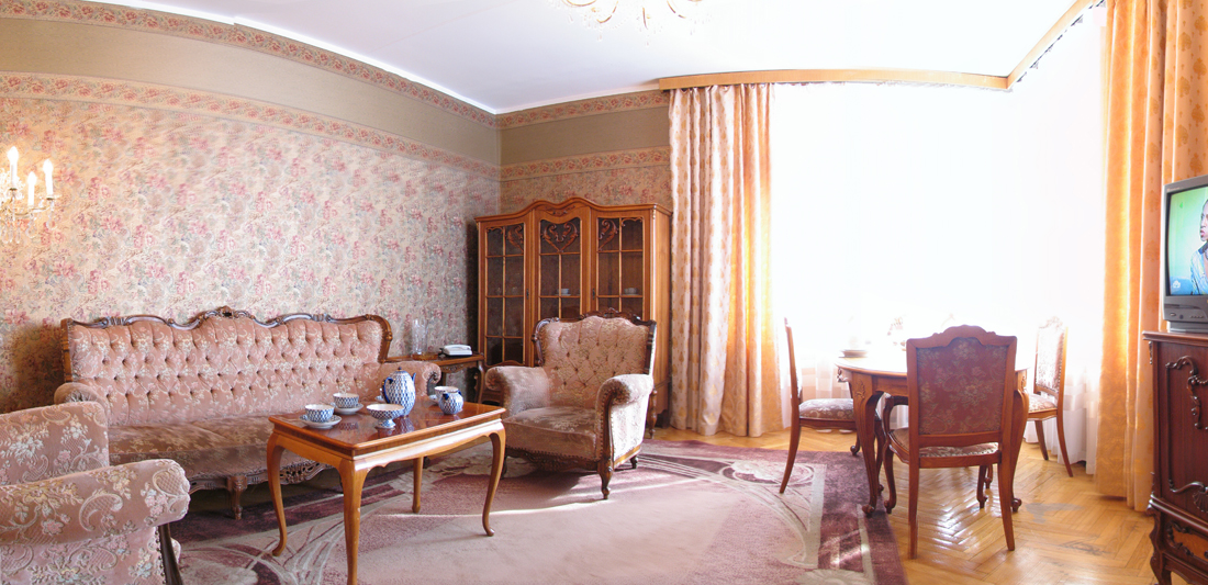 - 2-местный 2-комнатный "люкс": санузел с ванной. Гостиная: мягкая мебель, ТВ, журнальный и обеденный столы, набор столовой и чайной посуды на 6 персон, электрочайник, холодильник, московский телефон, лоджия. Имеется интернет. Спальня: большая кровать, тумбочки, бра, туалетный столик с зеркалом, телефон, платяной шкаф.