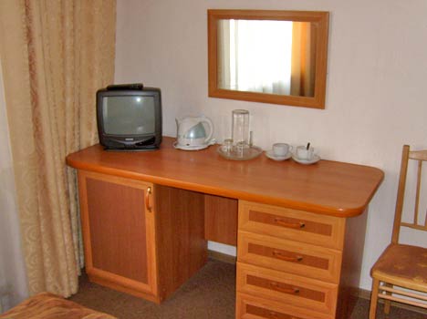- Мебель: односпальная кровать, прикроватная тумбочка, шкаф, стол,стулья, зеркало