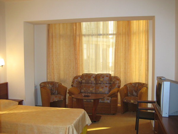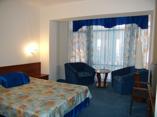 - Номер категории «Студио» - однокомнатный номер, по площади 23 м?, оформлен в европейском стиле, оборудован современной комфортабельной мебелью. Рассчитан на 2 основных и 1-2 дополнительное место (одна кровать king-size или две раздельные queen-size, ванная комната, шкаф купе с зеркальными дверьми;, журнальный столик;, два кресла (раскладных), либо диван (раскладной) и два кресла, телевизор, сейф, кондиционер. Во всех ванных комнатах имеется ванна, ванные аксессуары, фен). Номер категории «апартаменты» – одно-, двух- и трехкомнатные (корпус «B»). Все номера данной категории с балконом и видом на море, а также видом на бассейн.
