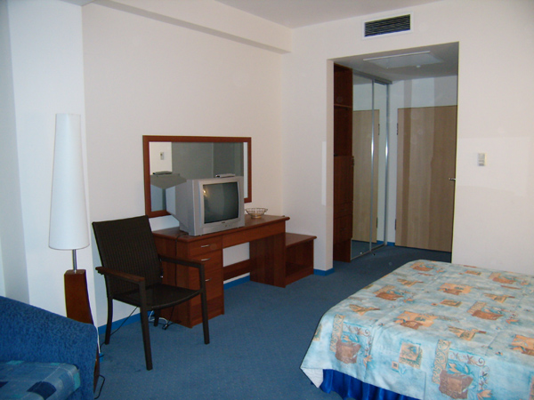 - Однокомнатные апартаменты: элегантный 1-но комнатный номер с балконом. Состоит из гостиной, спальни и ванной комнаты, площадью 32 кв.м. Номер оборудован современной, комфортабельной мебелью, кровать king-size или две раздельные кровати queen-size, шкаф-купе, мягкий диван с креслом, мини-кухня с барной стойкой и укомплектованным набором посуды, TV с дистанционным пультом, холодильник. Для хранения документов, ценных вещей, денег номер оборудован специальным сейфом.