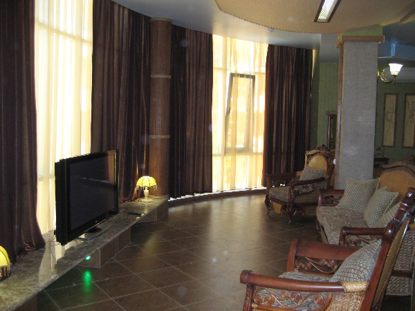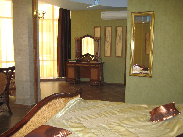 VIP номер 4-й этаж. Элитный номер, с изумительным видом на море, сочетает в себе современный дизайн, европейский комфорт и отличный сервис. Располагает прекрасными условиями для отдыха (элитная 2-х спальная кровать с двумя прилагающимися к ней тумбочками, мягкий кожаный диван и пуфик, трюмо, журнальный столик, сейф, плазменный телевизор, световое дизайнерское освещение, теплый пол – кафель, ванна – мрамор, джакузи с музыкой, музыкальная душевая кабина, холодильник, фен, чайник, посуда и приборы, халат, тапочки, солярий под открытым небом)