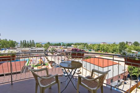 В номере: две полутороспальные кровати + диван, шкаф-купе, стол, стулья, зеркало, прикроватные тумбочки, набор посуды, санузел, душкабина, фен, полотенца, мыло, туалетная бумага, ортопедические матрасы; на балконе: стол, стулья; интернет – WI-FI, спутниковое ТВ, сплитсистема, сейф, холодильник, телефон. Возможно 1 доп. место на ребенка до 14 лет.