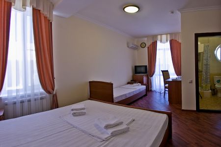 В номере: одна двуспальная и полутороспальная кровати, или три полутороспальные кровати, шкаф-купе, стол, стулья, зеркало, прикроватные тумбочки, набор посуды, санузел, полотенца, мыло, туалетная бумага, ортопедические матрасы; на балконе: стол, стулья; интернет – WI-FI, спутниковое ТВ, сейф, сплит-система, холодильник, телефон.