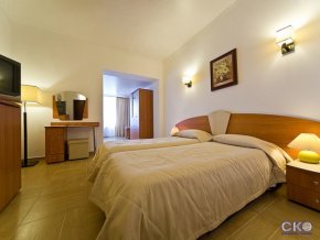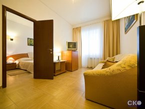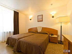 Четырехэтажное здание основного корпуса включает в себя 72 номера, из них: 6 номеров — одноместные (9м2), 41 номеров — однокомнатные двухместные (14м2), 13 номеров двухкомнатные двухместные (23м2), 4 номера — студия (23м2), 6 номеров — однокомнатный макси (25-27м2), 2 номера — студия+ (40м2). Во всех номерах: система кондиционирования, телевизор, холодильник, фен, телефон, посуда, сейф. Также предоставляется косметический (гигиенический) набор и комплект полотенец на каждого гостя. В студии+ дополнительно: микроволновая печь, соковыжималка, электрочайник. Уборка номеров- ежедневно, смена белья через 3 дня или по просьбе гостя. В трехэтажном эконом-корпусе первый этаж нежилой, номера располагаются на втором и третьем этажах. Коридор второго этажа представляет собой открытую веранду. Корпус включает в себя 8 номеров: 4 номера — двухместные (14м2) и 4 номера — одноместные (14м2). Во всех номерах: телевизор, холодильник, сейфовая ячейка, кондиционер, фен, посуда.