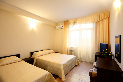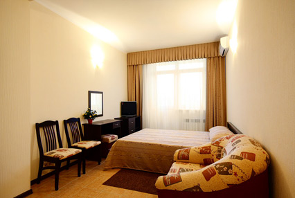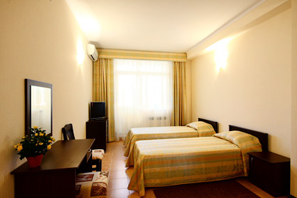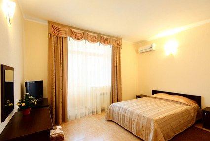 - односпальная кровать, две односпальные кровати/одна двуспальная кровать, прикроватные тумбочки, шкаф, стол, стулья, вешалка, обувная полка, сплит-система, телевизор ЖК, холодильник, санузел с душевой кабиной, фен, уборка номера через день, смена постельного белья через 7 дней, смена полотенец через 2 дня