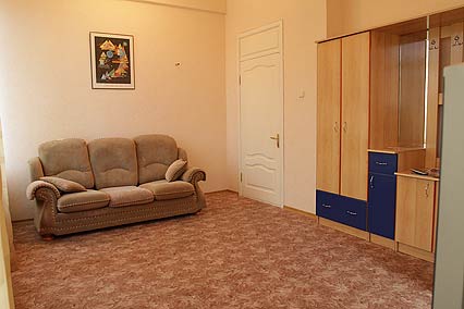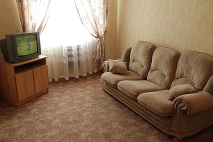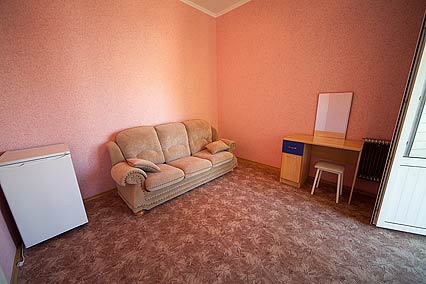 В номере: 2-х спальная кровать, два раскладных дивана, прикроватные тумбочки, ТВ-ЖК, сплит-система: шкаф, вешалка, туалетный столик с зеркалом, журнальный столик, банные принадлежности, чайник, набор посуды.