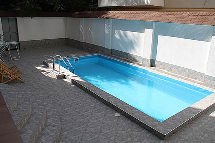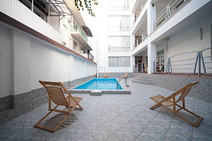 На уютном внутреннем дворике отеля КОНТИНЕНТ оборудован плавательный бассейн с шезлонгами и комфортабельными местами для отдыха.