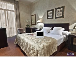 В номере: двуспальная кровать, кресло-кровать и односпальный диван(не во всех номерах), стол, мини-холодильник, LCD телевизор, сейф, сплит-система, телефон. В ванной комнате: ванна, фен, косметическое зеркало, набор индивидуальной косметики, халаты и тапочки, телефон. Сервис: Шампанское и фрукты в номер (при