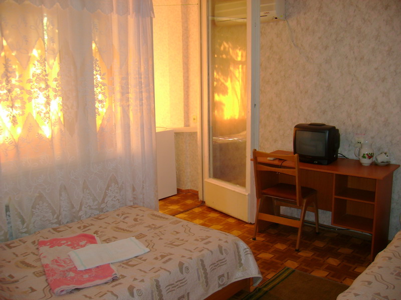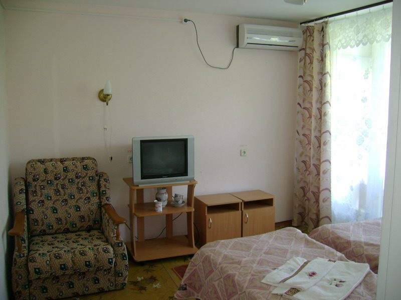 1-комнатный номер, мебель новая, две раздельные кровати, прикроватные тумбы, санузел совмещенный (душ, туалет, умывальник), телевизор, холодильник, кондиционер, водонагреватель. Лоджия застеклена. Дополнительное место – раскладушка. Номера с хорошим ремонтом.