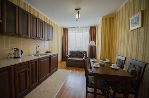 - Кухня с кухонными принадлежностями (холодильник, электроплита, электрочайник, набор посуды)