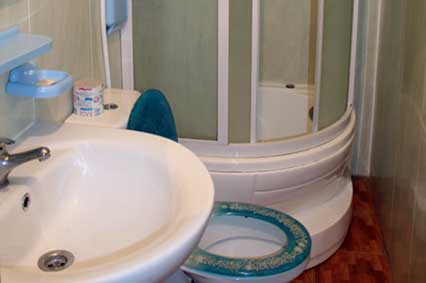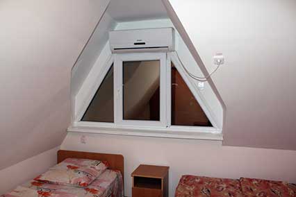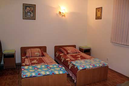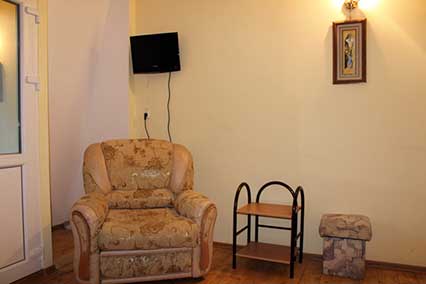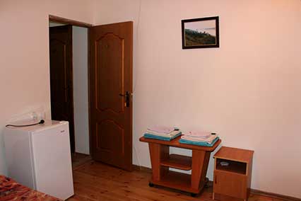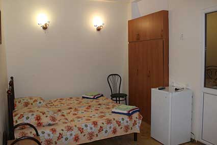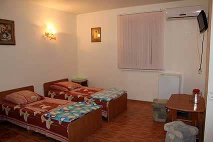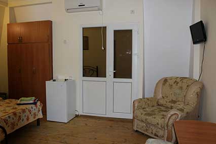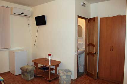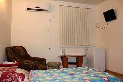 - 2-3-5-ти местные 1-но комнатные номера «Эконом» с удобствами на этаже (телевизор, холодильник, кондиционер – в номере; туалет, умывальник, душ – на этаже). Номера находятся на 4 этаже, удобства на 3 номера.