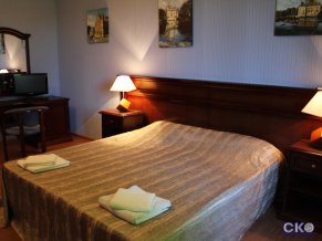 - 2-х местные 1-но комнатные номера "повышенной комфортности" с видом на набережную площадью 26 кв. метров оборудованы плазменным телевизором, феном, сплит – системой, душем, санузлом, полотенцесушителем и индивидуальным бойлером (площадь санузла – 4 кв. метра). Меблировка номера включает двуспальную кровать, прикроватные тумбочки и бра, трюмо, стул, комод. Дополнительным местом в номерах "повышенной комфортности" служит евро-раскладушка. Всего в отеле 4 номера повышенной комфортности.