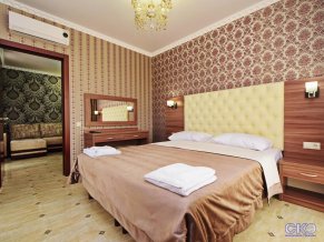 - Люкс трехкомнатный с балконом. В номере: Две спальни и гостиная. В спальне: двуспальная кровать, прикроватные тумбочки, туалетный столик, ЖК-телевизор, кондиционер, балкон.