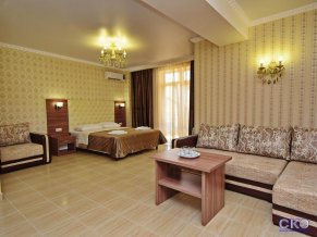 - Полулюкс пятиместный с балконом. В номере: двуспальная и односпальная кровати (либо раскладное кресло), раскладной диван, прикроватные тумбочки, шкаф-купе с зеркалом, стол, стулья, ЖК-телевизор, холодильник, кондиционер, балкон.