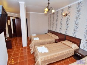 - Полулюкс четырехместный с балконом. В номере: двуспальная и две односпальные кровати (либо два раскладных кресла), прикроватные тумбочки, шкаф-купе с зеркалом, стол, стулья, ЖК-телевизор, холодильник, кондиционер, балкон.