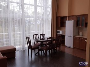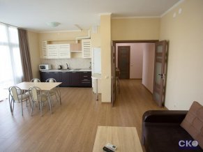 Гармония и стиль - отличительные особенности двухкомнатного номера, способного вместить до пяти человек. Номер подходит для длительного проживания. В нем есть два телевизора, проживающие оценят возможность смотреть разные телепередачи, имеется холодильник, кондиционер. Спальные места – две особенно большого размера кровати. Приятно проводить время на балконе, любуясь Медведь-горою и морским простором.