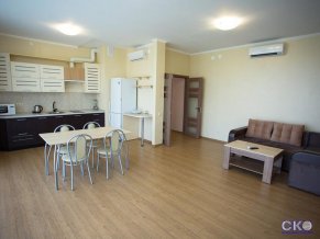 Шикарный четырехкомнатный номер с двумя спальнями, рабочим кабинетом, кухней-студией могут выбрать для проживания большая семья или дружная компания из 8 человек. Четверо постояльцев будут размещены на дополнительных местах. Стены пастельных оттенков служат фоном для картин восточной тематики. Большие окна дают ощущение свободы и пространства. Два санузла, оформленные в разных стилях, оборудованы душем.