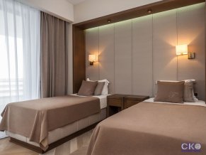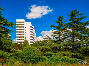 Санаторий состоит из 2 корпусов: 14-этажного главного корпуса с балконами и одноэтажного корпуса "Прибрежный", расположенного рядом с пляжем. Оба корпуса построены в стиле советского минимализма и окружены пышной южной растительностью. Номера в корпусе "Прибрежный" выполнены в классическом стиле и декорированы картинами с видами Крыма. Обновленные стильные номера главного корпуса оформлены в светлой бежевой гамме и обставлены современной мебелью. В главном корпусе расположены номера категорий: 18 Эконом, 59 Стандарт, 113 Полулюкс, 19 Люкс и 1 Сьют. Есть 1 номер Стандарт для людей с ограниченными физическими возможностями. В корпусе "Прибрежный" номера категорий: 6 Полулюкс, 4 Люкс и 2 Сьют. В номерах кровати с ортопедическими матрасами, пляжные полотенца, штопор, рожок и губка для обуви, щетка для одежды. На каждом этаже главного корпуса в общем доступе гладильная комната. Пользование ячейками для хранения ценностей на центральной стойке приема гостей.