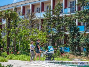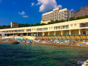 Собственный мелкогалечный пляж находится в 100 метрах от корпуса. На пляже душевые кабины, кабины для переодевания, туалет, пляжного оборудования, спасательная станция. Пляж оборудован теневыми навесами, шезлонгами.