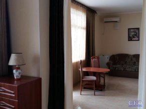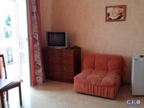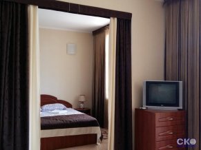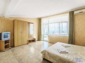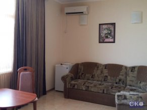 Номер с раздельными комнатами расположен на 2 этаже, выход на большой балкон из двух комнат, боковой вид на море. Шикарный вариант для семьи 4-5чел. В гостиной угловой диван и кресло-кровать; в спальне – двуспальная кровать. В номере: кондиционер, ТВ, холодильник, бесплатный Wi-Fi. На территории: парковка, открытый бассейн, кафе, сауна/массажная комната, бильярд, теннис. Усадьба располагает двумя территориями. Номер находится на территории в ста метрах от парка.
