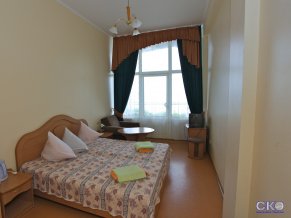 В номерах: 2 раздельные кровати, тумбочки, трюмо, стулья, встроенный шкаф, санузел (душ, умывальник, туалет), телевизор, холодильник, лоджия.