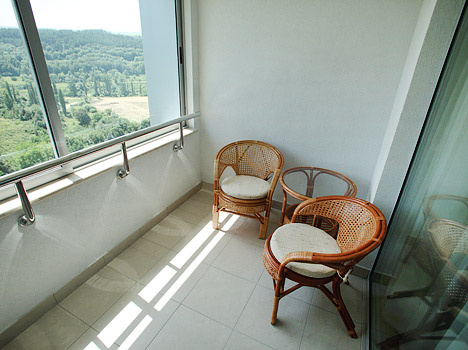 - 1-но местные номера (В номере: полутороспальная кровать, санузел с ванной и душевой кабиной, сейф, ЖК телевизор, система кондиционирования, набор посуды, телефон, балкон с мебелью, современный ремонт, площадь номера 33 кв.м.)