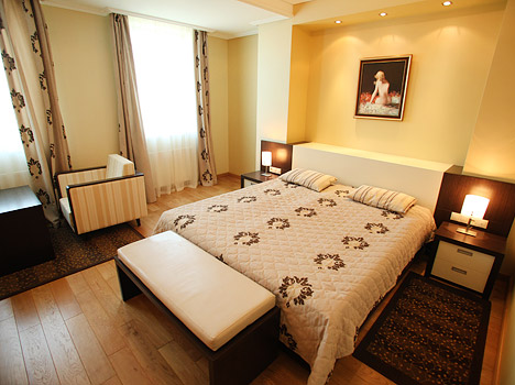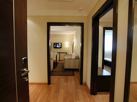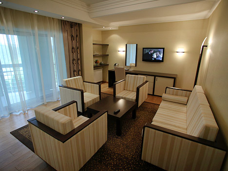 - 2-х местный 2-х комн. Люкс номер (В номере: спальня с двухспальной кроватью, гостинная с диваном и столом со стульями, 2 санузла, гостевой и санузел с ванной и душевой кабиной, сейф, ЖК телевизор, система кондиционирования, набор посуды, телефон, балкон с мебелью, современный ремонт, площадь номера 80 кв.м.)