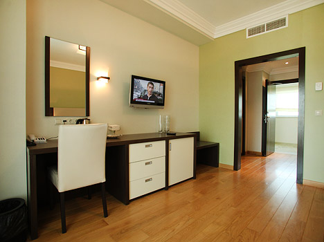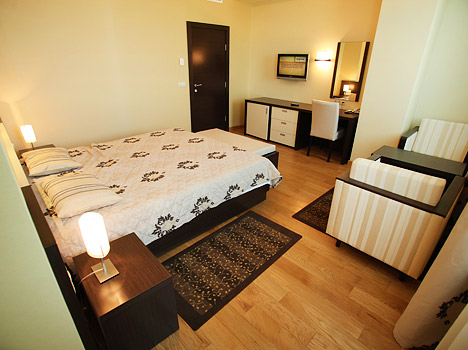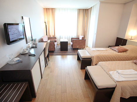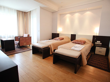 - 2-х местные Твин номера (В номере: две односпальные кровати, диван, санузел с ванной и душевой кабиной, сейф, ЖК телевизор, система кондиционирования, набор посуды, телефон, балкон с мебелью, современный ремонт, площадь номера 42 кв.м.)